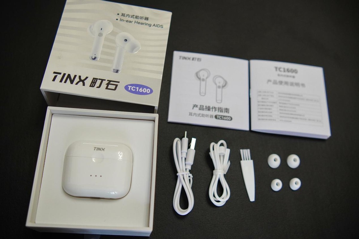 打开町石tinx tc 1600助听器的包装盒时,首先映入眼帘的是其精致的充电盒,出门携带方便,没电的时候可以随时充电。其中的配件也非常齐全,包括耳塞套、Type-C充电线、绕颈挂绳、使用说明书和操作指南。
