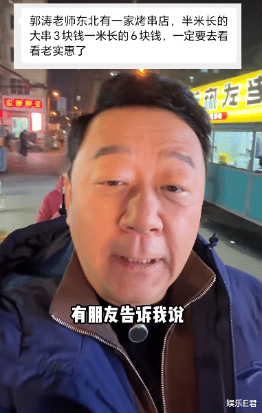 近日,演员郭涛在个人短视频账号发布一条探店视频,称东北有一家烧烤店,半米长的大串3块钱,一米长的6块钱,噱头满满,十分诱人。