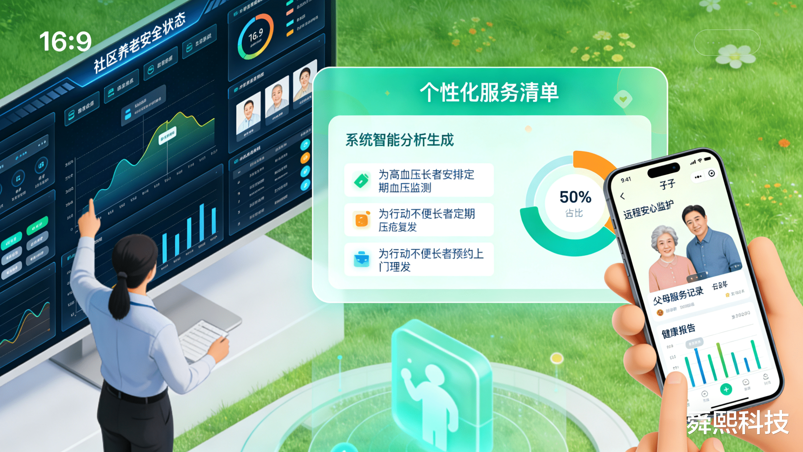南京某社区使用该系统后,服务效率大幅提升。社区主任李女士介绍:“以前要靠人工挨家走访了解需求,现在系统会自动提醒‘张阿姨该复查血糖了’‘王爷爷需要更换助行器’,我们能精准安排服务,避免资源浪费。”子女也能通过关联APP,随时查看父母的服务记录和健康报告,哪怕身在外地,也能清晰掌握父母的养老动态,实现“远程安心监护”。