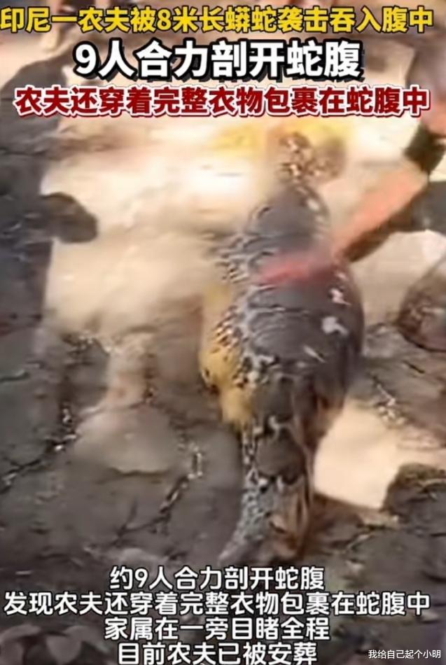 印尼苏拉威西省一位61岁的农夫出门喂牲口,但是4日出门,5日还没归家,于是家人发动村民寻找老人,结果没找到老人,却在家附近找到一个8米长的巨蟒,而且蟒蛇的肚子明显很大,此时村民很清楚,老人或许遭遇不测。