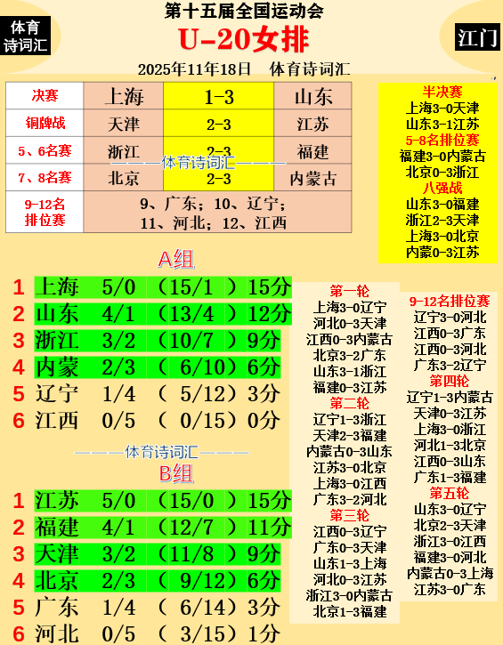 今晚后,U-20女排全部结束,成绩为:1、山东;2、上海;3、江苏;4、天津;5、福建;6、浙江;7、内蒙古;8、北京;9、广东;10、辽宁;11、河北;12、江西。
