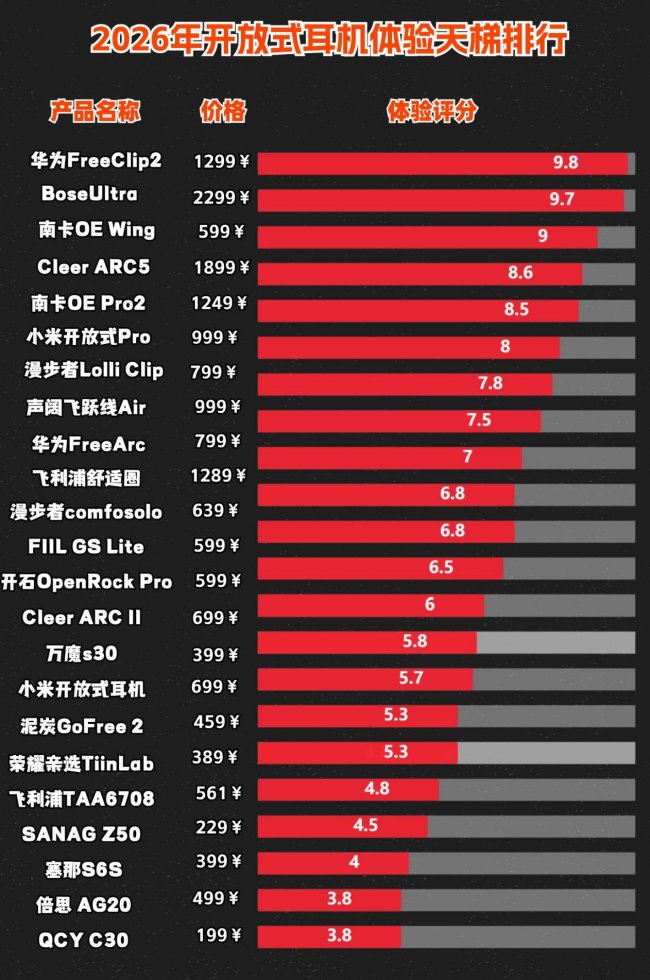 2026 年依旧是开放式耳机全面爆发的一年,不管是主打蓝牙音频的品牌,还是专业 HiFi 厂商,基本都推出了自家的开放式蓝牙耳机。如今的开放式耳机,在音质和漏音控制上都有了明显优化,不少优秀机型甚至能做到媲美封闭式耳机的听感,同时还保留了不入耳的设计,把音质、佩戴舒适度和使用健康性兼顾得很好。对运动爱好者来说,也终于不用再忍受骨传导耳机那种酥麻震感,多了一个更舒服的新选择。