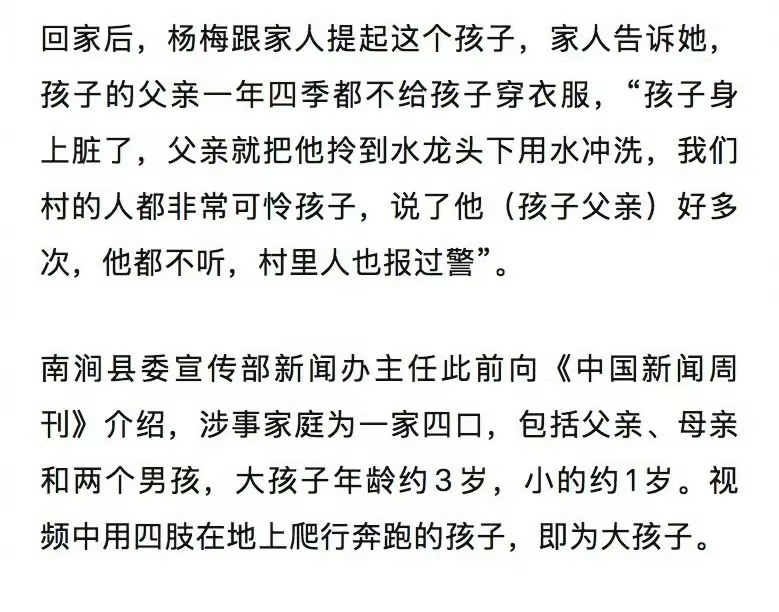 南涧县委宣传部新闻办主任称这个野人小孩是一对兄弟,他还有一个一岁的弟弟,视频里所拍的全是哥哥。村民多次见野人小孩被他爸爸大冬天拉去水龙头底下冲洗身体,很多人看不过去劝说都不听,报警也没有用。孩子的妈妈也不喜欢人家说她,每次一说就用眼睛去瞪别人,导致很多人也不太敢去劝说。