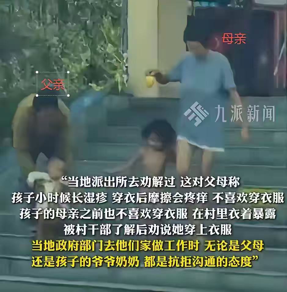 另外一个视频拍到他们一家四口,野人小孩的弟弟也曝光了出来。他弟弟是有穿衣服的,之所以不给哥哥穿,他们的妈妈回应称是因为哥哥从小就湿疹,是他自己不爱穿,所以就习惯了。小孩三岁不当回事,但至少应该给穿条内裤吧!