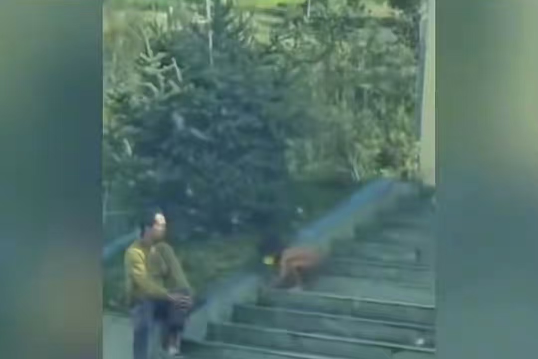 有网友拍到野人小孩一家人在一个楼梯处玩耍,他的妈妈牵着他走下楼梯,可以看出他不是不会走路。杨梅第一次见野人小孩的时候,他就是会走路的。