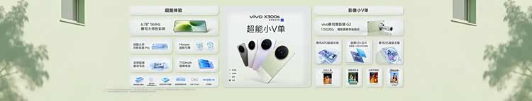 作为兼顾相机与手机优势的影像新物种,不但相机能力拉满,手机的旗舰体验也毫不妥协。vivo X300 Ultra搭载了第五代骁龙8至尊版芯片、6600mAh蓝海电池、100W超快闪充+40W无线闪充带来强悍性能和续航表现,搭配5年持久流畅的OriginOS 6,从内到外,重塑全方位越级体验。超能小V单vivo X300s,方方面面全部Super作为一台实力强劲的「超能小V单」,vivo X300s不仅拥有小V单的专业影像,还带来了超越全能的游戏体验。此外,vivo X300s采用6.78英寸大直屏设计,背盖升级成云缎砂玻璃,融合悬浮水滴冷雕玻璃工艺,握持温润舒适。镜头极简圆环设计,经典且高级。胶片绿、梦核紫、银白及钛黑四款治愈系配色,活力拉满。