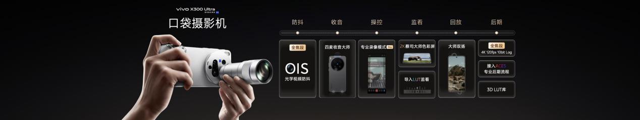 全链路专业视频能力,让创作从定格走向流动创作自由不只属于静态影像,为此vivo X300 Ultra视频能力再度升级。不仅全焦段视频高规格,而且全焦段视频好画质。防抖方面,全焦段OIS光学视频防抖,其长焦3°OIS光学防抖能力,即使装上增距镜拍摄,依然稳定出片。收音方面,四麦收音大师,支持6大场景化收音预设,一键获得高质量的收音,还可以连接专业的无线麦,实现收音自由。在监看上,2K蔡司大师色彩屏作为取景器,全场景取景和监看时色彩更真实;参考专业电影摄影机全新推出的专业录像模式Pro,参数布局清晰,调节更便利,一键清屏功能只需轻点屏幕,便可沉浸式构图;开放的自定义3D Lut导入监看功能,让用户可以将常用的调色LUT直接加载进取景器,拍摄时就能预览最终的电影色调。在回放上,全新升级的大师双扬,上扬净腔体积提升至270%,堪比电影级声场。最后也是最重要的一步,在后期方面,全焦段4K 120fps 10bit Log,422采样,APV帧内编码,完整将色彩和影调的决定权交给后期;同时vivo Log已适配ACES专业后期流程,让Log素材能与专业电影摄影机素材在同个色彩空间协同调色,无缝对接影视制作体系。此外,还可直接在相册中预览、烧录3D Lut,vivo摄影App还内置3D Lut库,定期更新风格化预设,让用户轻松获得独特的调色风格。V单真正打通了从拍摄到后期、完整可控的专业视频创作工作流,当用户在观看演唱会或体育赛事时,抬手就能拍出转播级画面。