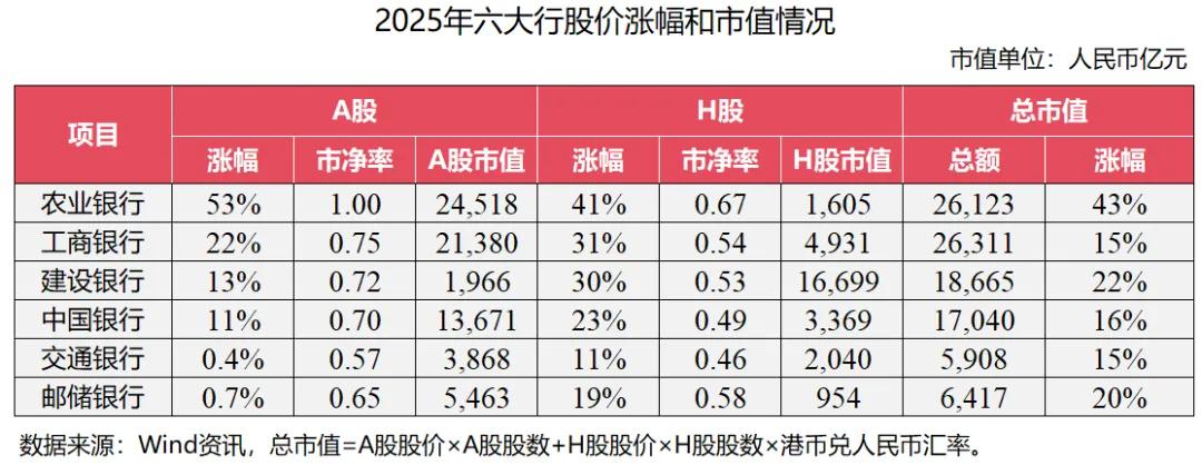 三、从总市值上看,2025年年末,农行年末总市值2.61万亿。同期,工行2.63万亿、建行1.87万亿、中行1.70万亿。