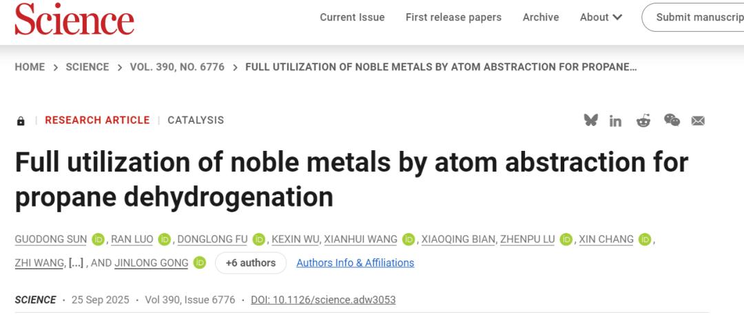 论文标题 Full utilization of noble metals by atom abstraction for propane dehydrogenation