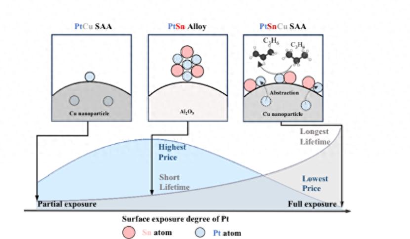左图:传统PtCu单原子合金催化剂,大量铂原子(浅蓝)被埋藏,表面暴露度低。中图:工业PtSn合金催化剂,铂原子在合金中仍无法完全暴露。右图:本研究提出的新型PtSnCu催化剂,锡原子(红)通过“原子抽象”作用,将铂原子从铜颗粒内部“牵引”至表面,形成完全暴露的活性位点。