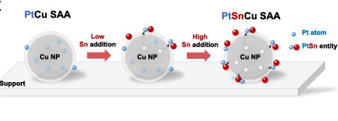 当锡被加入到体系中时,它自发地迁移到铜颗粒表面,并利用这股强大的“拉力”,将埋在内部的铂原子一个一个地“拽”到了表面。最终,铂和锡在颗粒表面形成了稳定的“铂-锡原子对”。这样,几乎所有的铂原子都以完全暴露的金属单原子形式,展现在了开放的表面上。