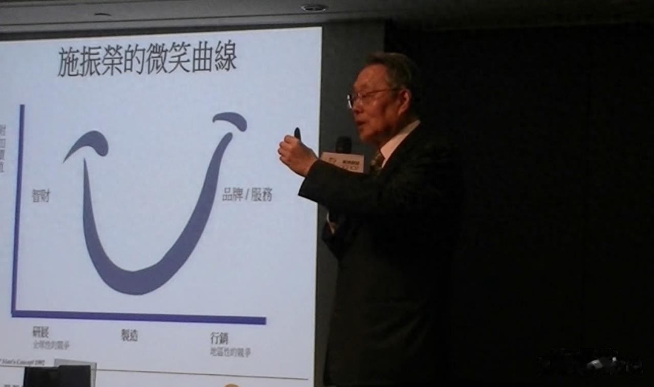 “微笑曲线”理论具体指:在IT制造业中,产品附加价值较高的区段集中在两端,也就是前端(左侧)的研发、设计与后端(右侧)的营销、服务,而中段的制造则是附加价值最低,呈“中间低、两端高”的形状。
