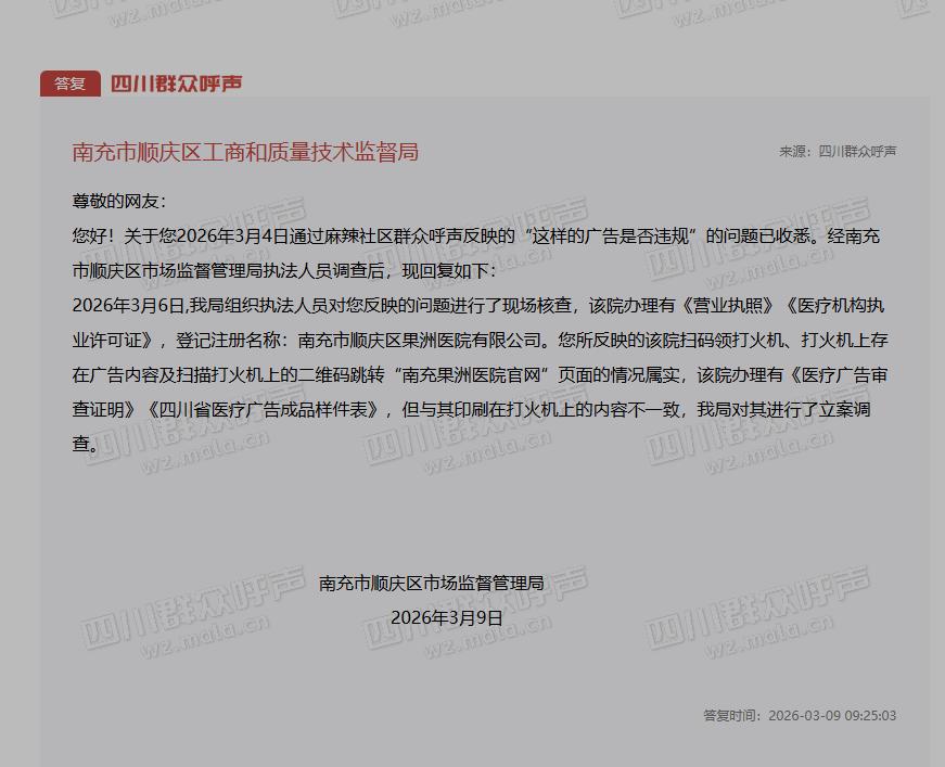 您好!关于您2026年3月4日通过麻辣社区群众呼声反映的“这样的广告是否违规”的问题已收悉。经南充市顺庆区市场监督管理局执法人员调查后,现回复如下:
