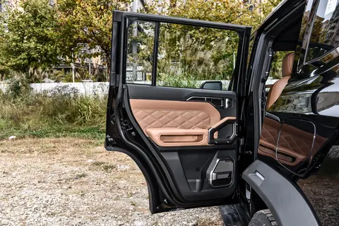 值得一提的是车身比例的把控,4795/2006/1880mm的尺寸搭配2800mm的轴距,既保证了硬派造型的视觉张力,又为车内空间预留了充足基础。车顶的行李架不仅是装饰,列阵式高密度车顶设计让其抗压强、承重稳,日常加装行李箱或户外装备都完全够用,这对于喜欢旅行的用户来说实用性拉满。