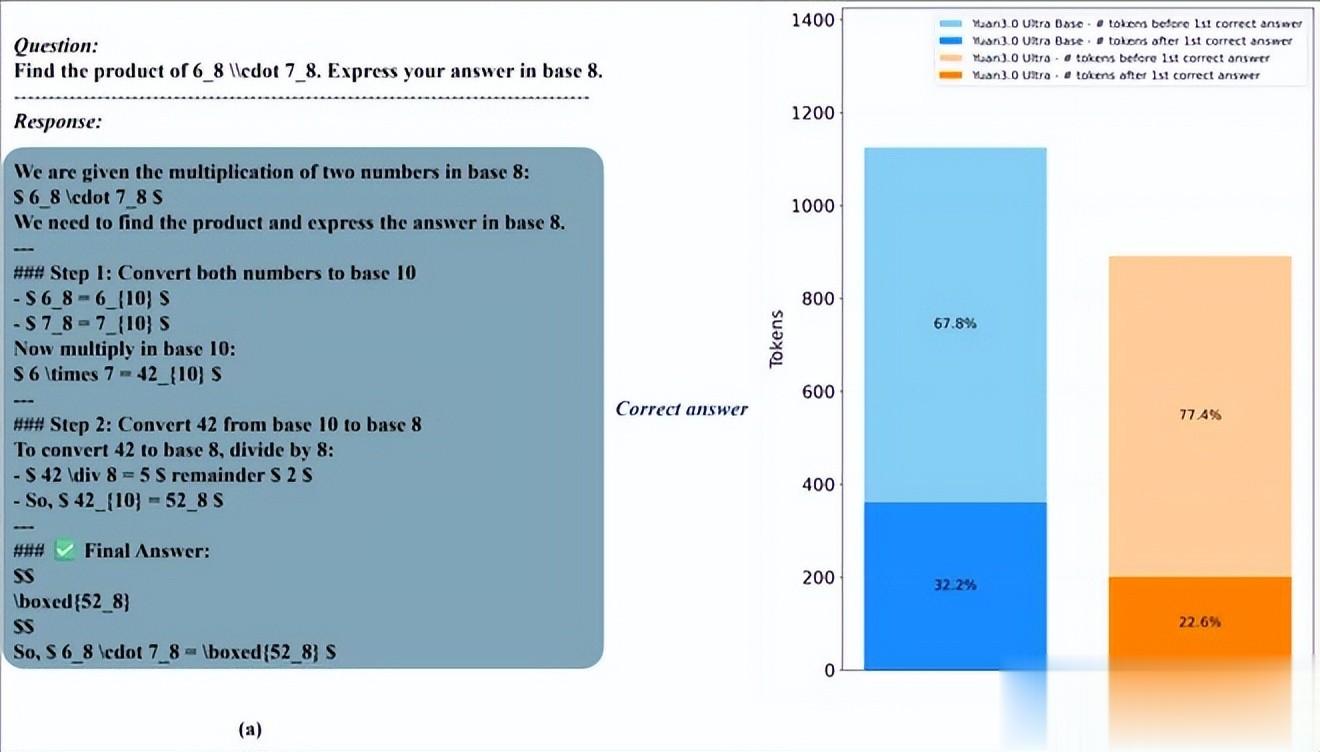 Yuan3.0 Ultra引入了RIRM(反思抑制奖励机制)。这就像在模型训练时设立一套新的奖励规则:不仅奖励“答对”,更奖励“在答对后及时停止无效思考”。通过强化学习,模型学会了在复杂任务中进行深度推理,在简单任务中快速响应,在获得可靠答案后主动收敛。
