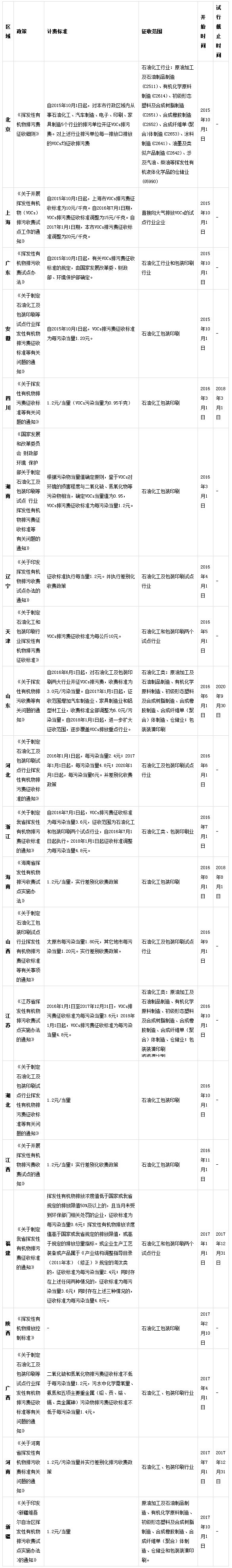 根据最新的环保数据,已经先后有21个省市试点征收VOCs排污费。各省市试点行业除了环保部规定的石化行业,包装行业外,还可针对本地的情况来调整收费行业。以上海为例,VOCS排污费已经扩展到石油化工、船舶制造、汽车制造、包装印刷、家具制造、电子等12个大类行业中的71个中小类行业,基本覆盖了该市工业VOCs重点排放行业。