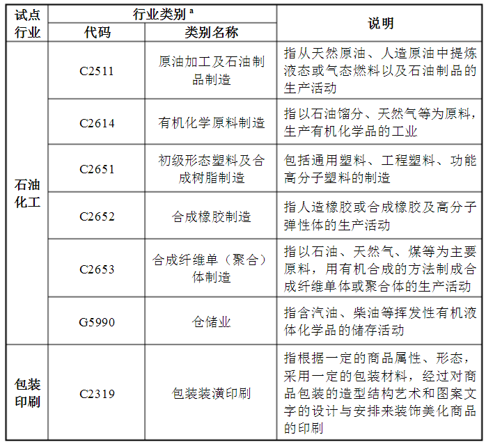 一. 我国VOCs排污收费试点行业范围表