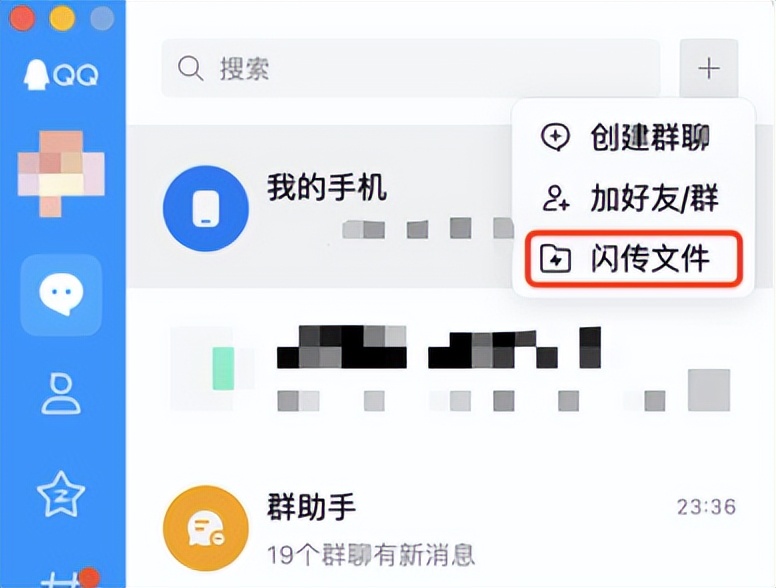 只需将QQ升级至Windows 9.9.19或Mac 6.9.73最新版,在QQ的聊天列表界面,点击右上角的“+”,就可以看到新增的“闪传文件”功能了。