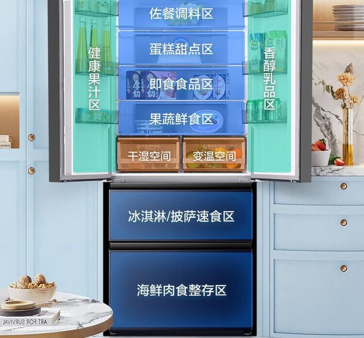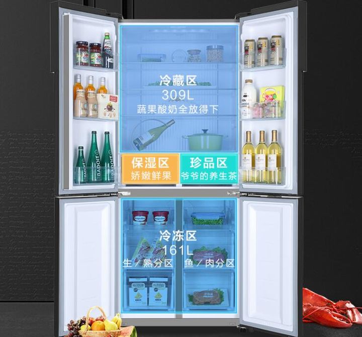 总容量510L,冷藏299L(内含鲜活保湿区,三档变温区29L),182L(双托盘+4独立冷冻抽屉)美菱510还配置了云保湿技术,-32℃深冷速冻技术,整体保鲜效果非常不错。这款冰箱颜值也挺高的。