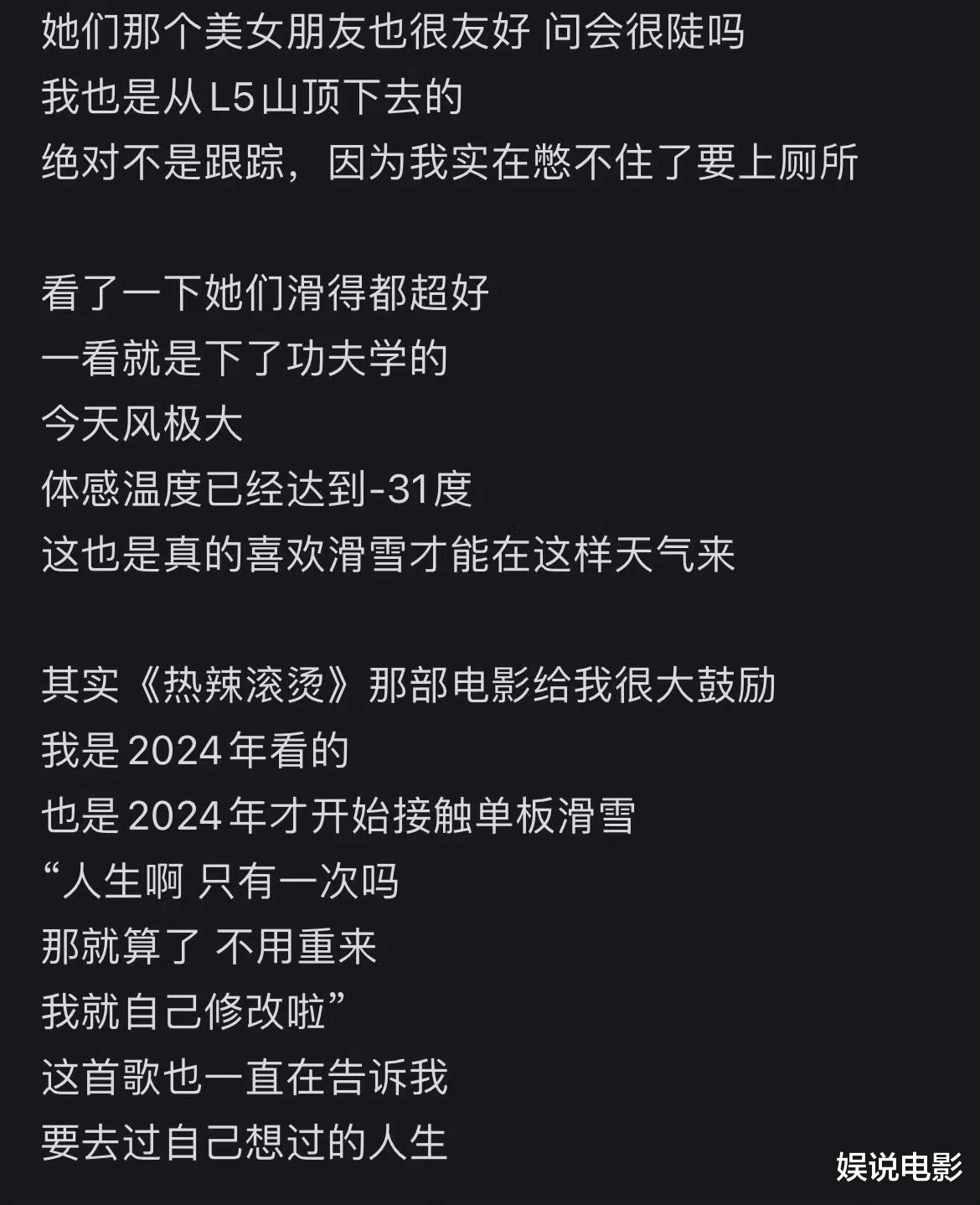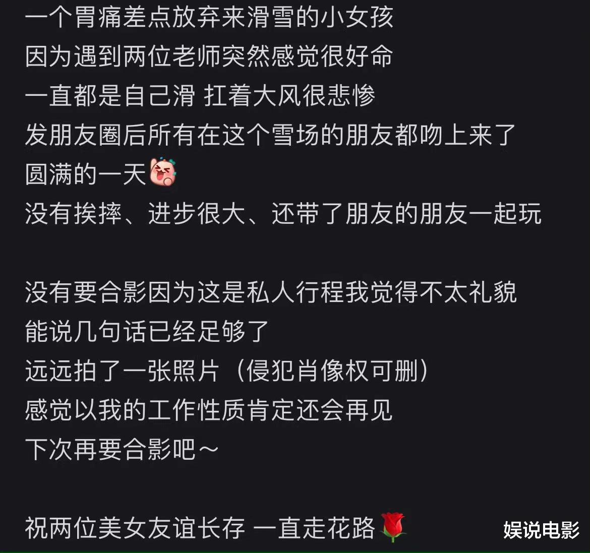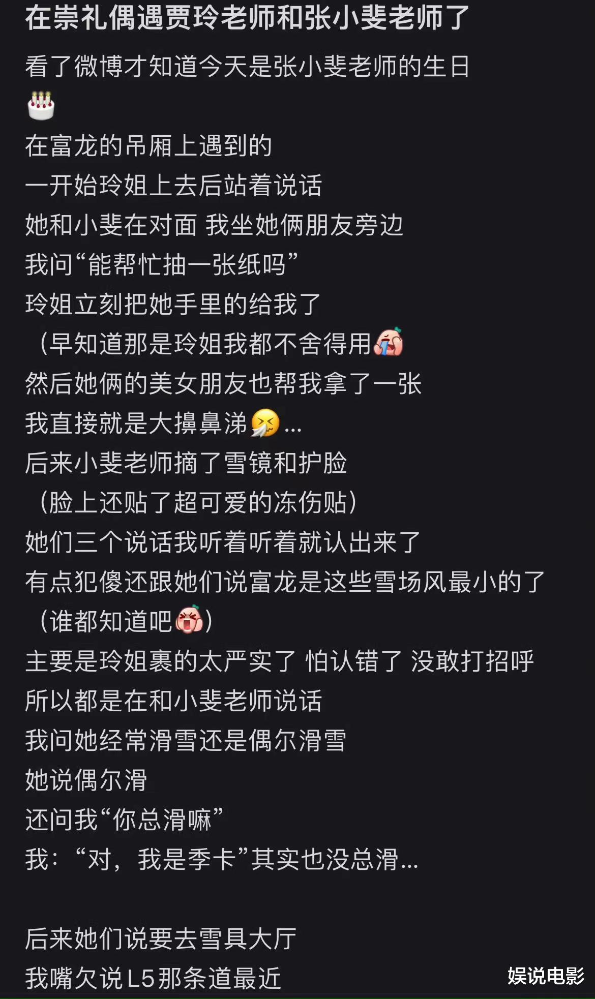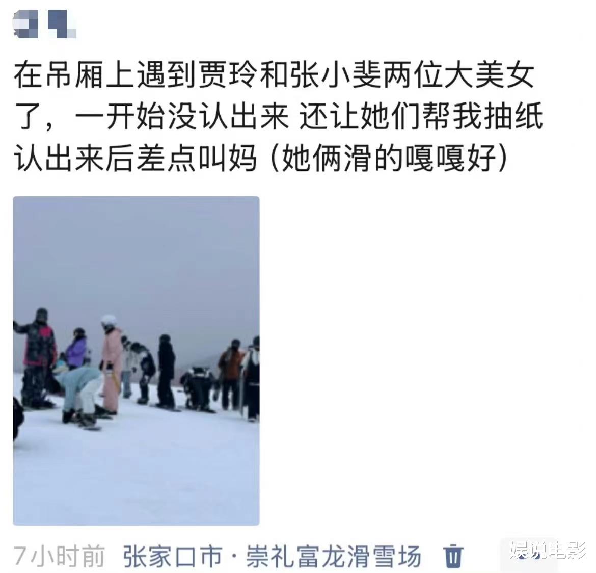 网友去河北滑雪,偶遇贾玲和张小斐,还让贾玲给她拿了纸巾,因为贾玲穿得太厚实,没有认出来,她们一共三个人,而不是两个人,所以是和好姐妹们的聚会。