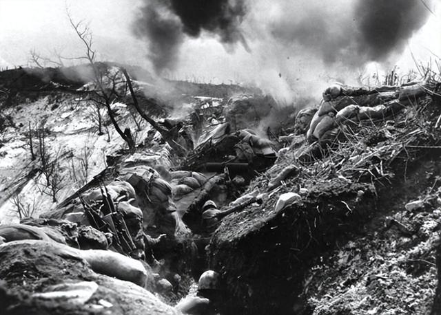 在一片弹雨中,战士们相互掩护,勇敢地冲向敌军阵地。