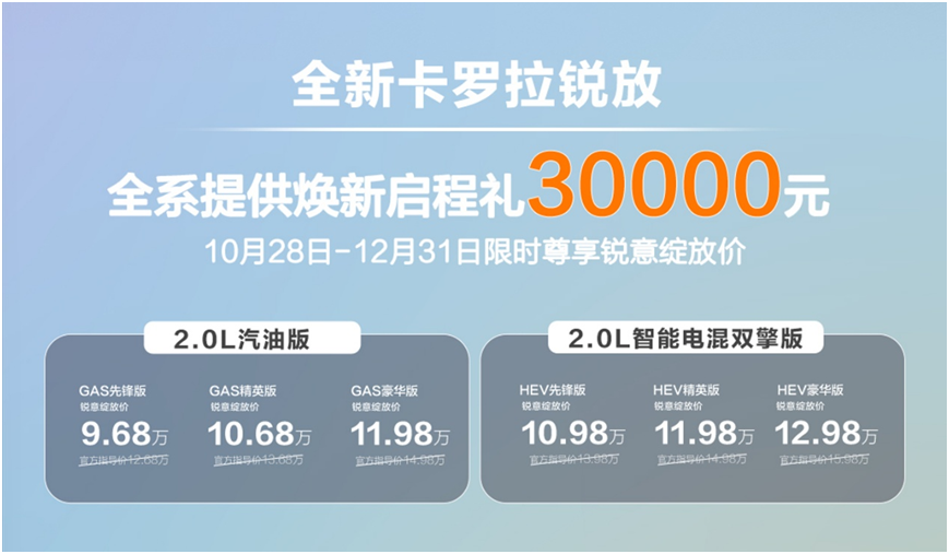全新卡罗拉锐放以极具诚意的定价策略震撼市场。在本身富有竞争力的官方指导价基础上,叠加高达30,000元的“焕新启程礼”限时权益,购车门槛被大幅拉低。这意味着用户能以更轻松的成本,拥趸一款集全球品质与本土智慧于一体的全能SUV,真正实现一步到位的价值之选。