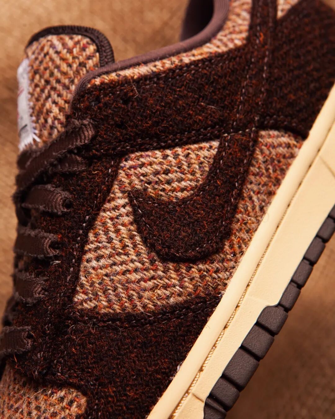 上次 Nike 与 Harris Tweed 合作做鞋,印象中还是十多年前的事。这次双方再次携手,围绕 Dunk Low 鞋款推出了三个款式。其中我个人比较喜欢棕色的女款,鞋面以巴洛克棕色和深棕色两种颜色来拼接,并采用不同花纹来演绎以增强层次感,十分奢华。除此之外,整双鞋子最亮眼的地方我觉得在于鞋舌的设计,Nike 采用鸳鸯设计,一边是 Nike Logo,另一边直接把 Harris Tweed 经典的 Logo 布标缝合于此,标志性和巧思都体现出来了,一箭双雕。