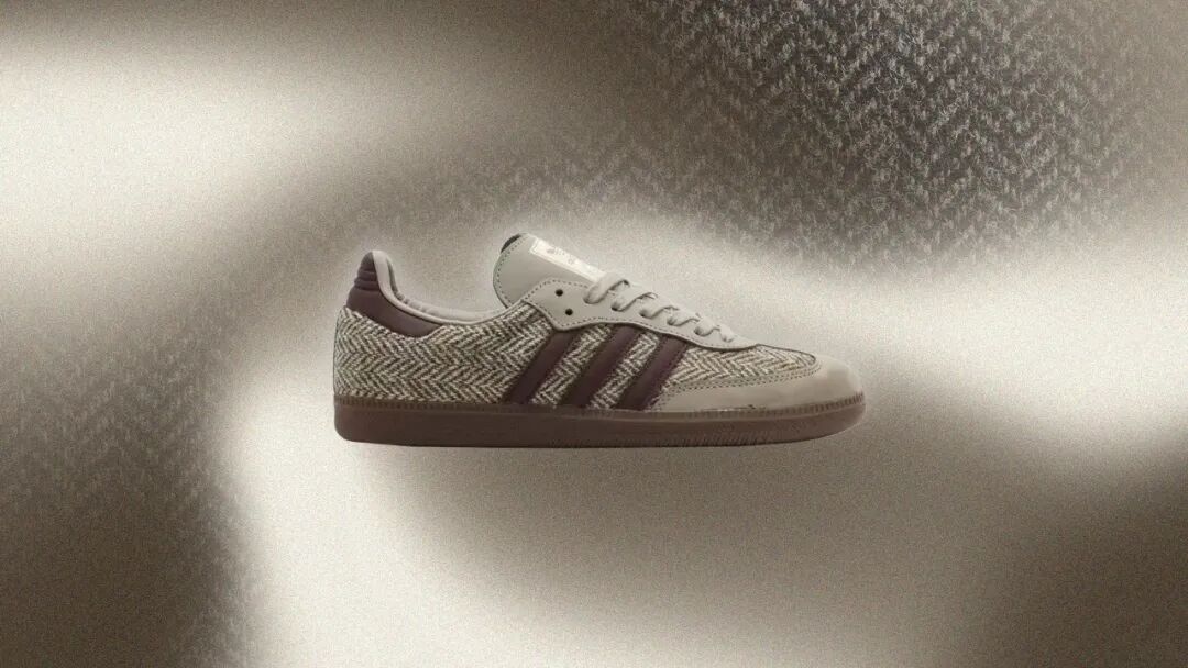 由 adidas 出品的现象级鞋款 Samba,也曾推出过由 Harris Tweed 演绎的款式。如图所示,这款 Samba 鞋面也是采用多种材质拼接的形式来打造,其中鞋头、鞋舌是麂皮材质,鞋尾和鞋侧三条杠是皮革材质,而其余的部分就是经典的斜纹状 Harris Tweed 材质。而且 Harris Tweed 作为占据鞋面面积最大的部分,复古韵味尽显无遗。