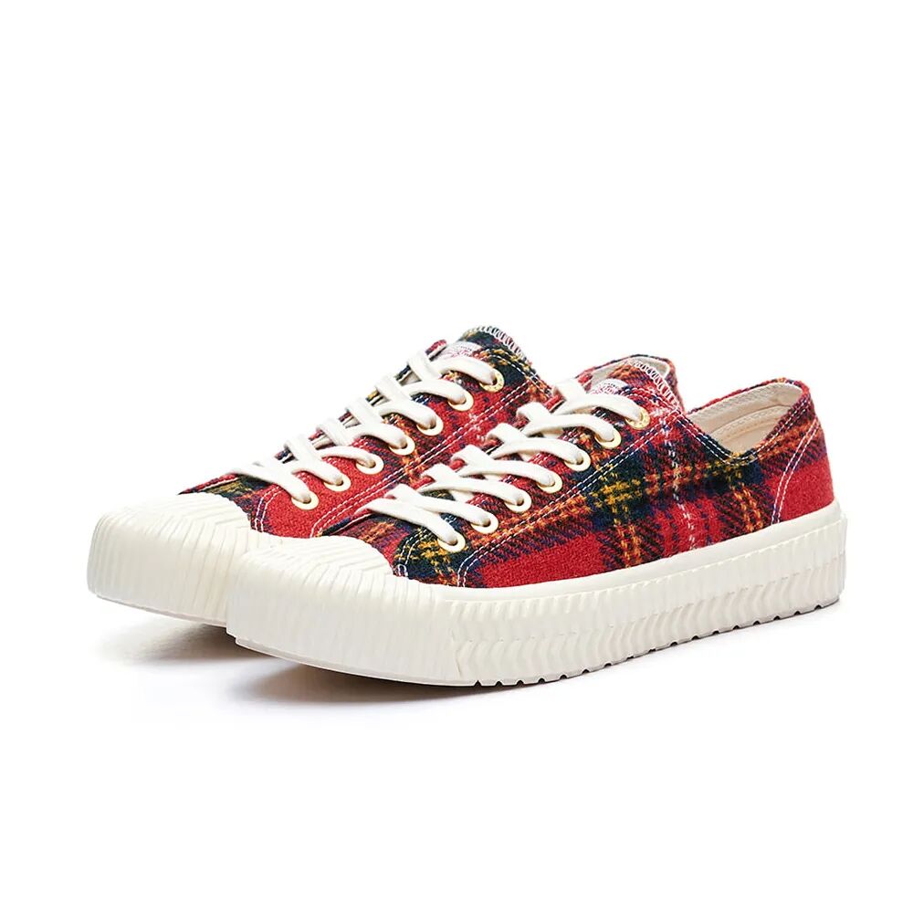 最后一双,给大家介绍一双比较冷门的 EXCELSIOR。翻了翻记录,EXCELSIOR 上次出现在我们冷门球鞋栏目还是在 2017 年。这个来自法国,并被誉为饼干鞋始祖的品牌,此前在韩国已经收获了不少拥趸。看到这款,其将 Harris Tweed 材质取代了原来的布面材质,大体的红色花纹十分吸睛,大胆有个性。