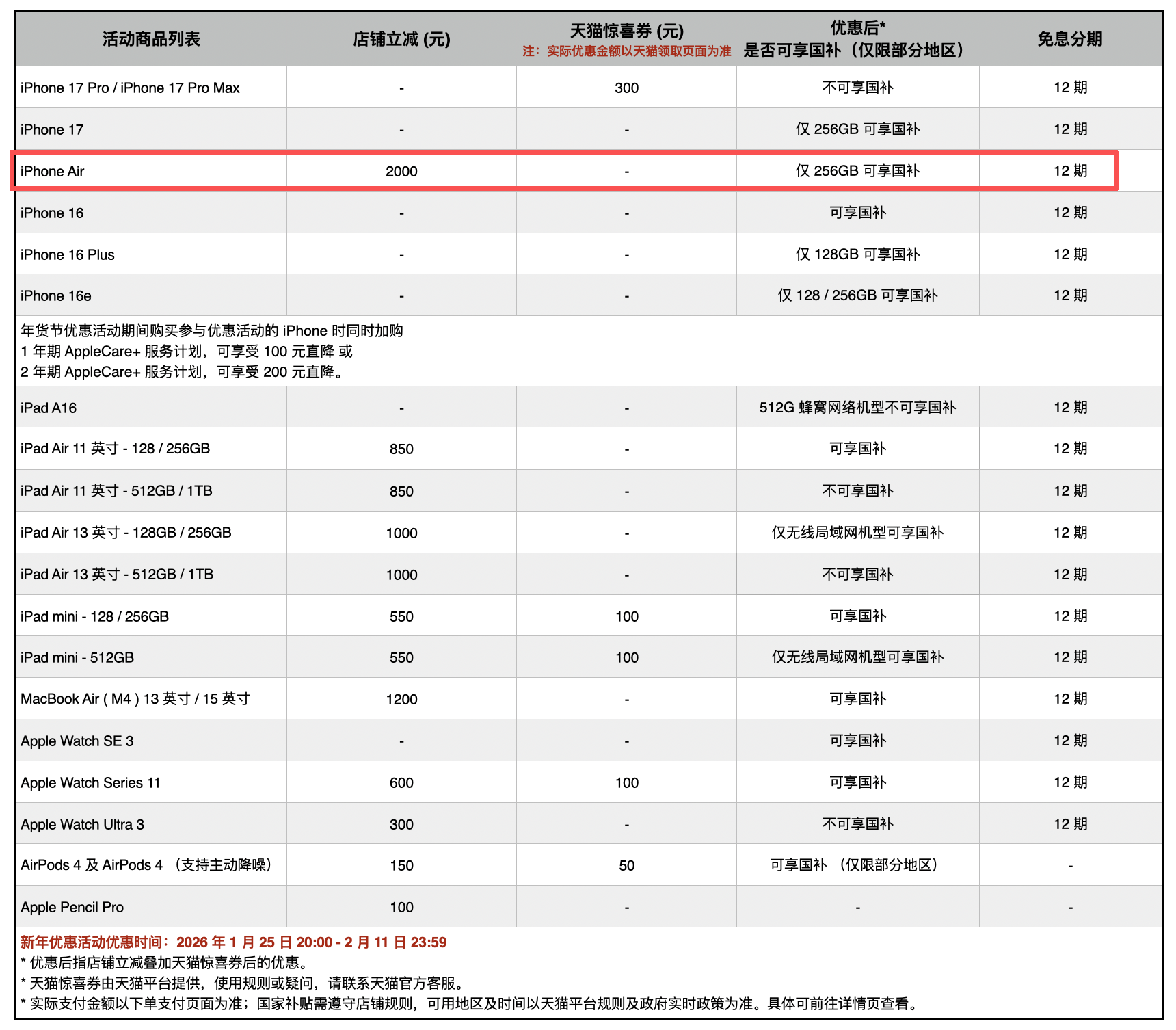 这次iPhone Air大降价并不是PDD或者那些第三方平台、第三方店铺,而是苹果官方在天猫的Apple Store官旗店,这可是货真价实的苹果官方店铺,其权威性甚至超过了东哥自营,大家放心购买。苹果官方这次提前说明了,只准备了合计约1.3万台iPhoneAir,售完即止。也就是说这个2000元的优惠券是限时限量的,大家拼手速,并不是敞开卖。iPhone Air是在2025年9月10日发布,但是直到10月22日才在国内发售,现在2026年1月25日就直接降价2000元,然后触发低于6000元国补500的机制,合一起那就优惠了2500元。