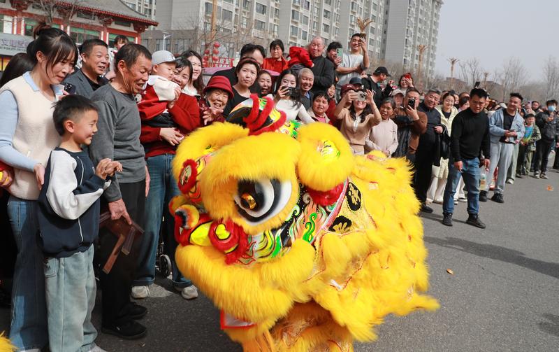 2月21日,华阴市非遗社火展演活动现场,舞狮表演中与群众互动。