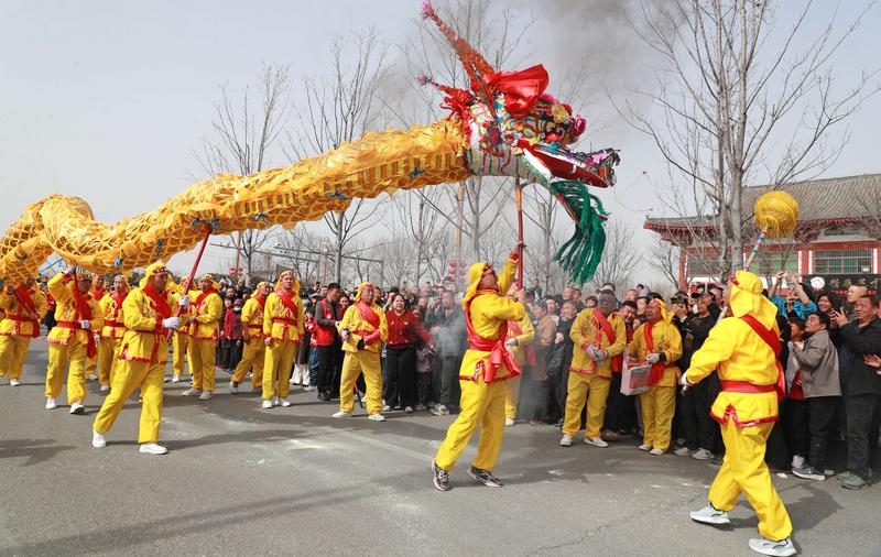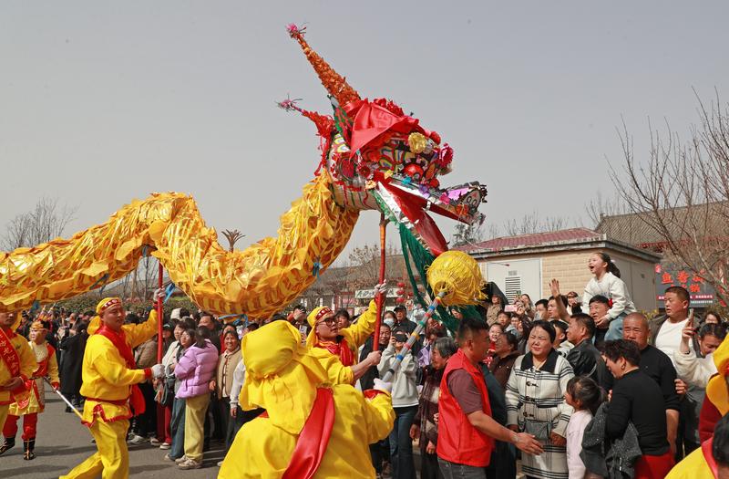 2月21日,华阴市非遗社火展演活动现场进行舞龙表演。