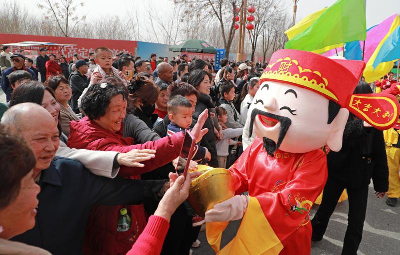 2月21日,华阴市非遗社火展演活动现场,“财神爷”在表演中为群众添财。