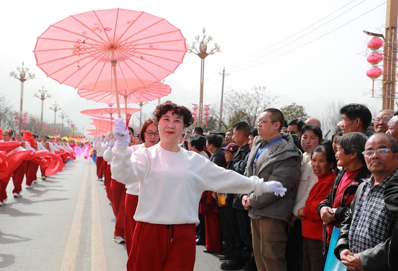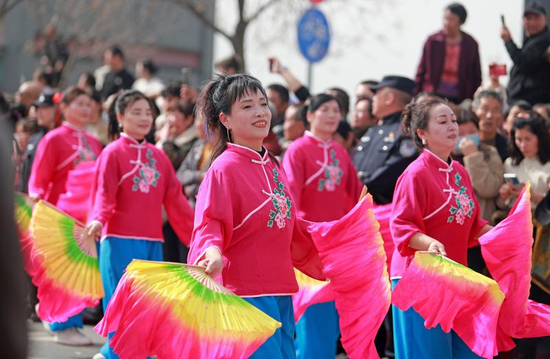 2月21日,华阴市非遗社火展演活动现场,群众载歌载舞欢庆佳节。