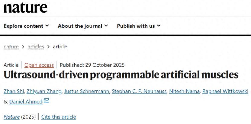 Shi Z†, Zhang Z†, Schnermann J, Neuhauss SCF, Nama N, Wittkowski R, Ahmed D: Ultrasound-driven programmable artificial muscles. Nature (2025). doi: 10.1038/s41586-025-09650-3