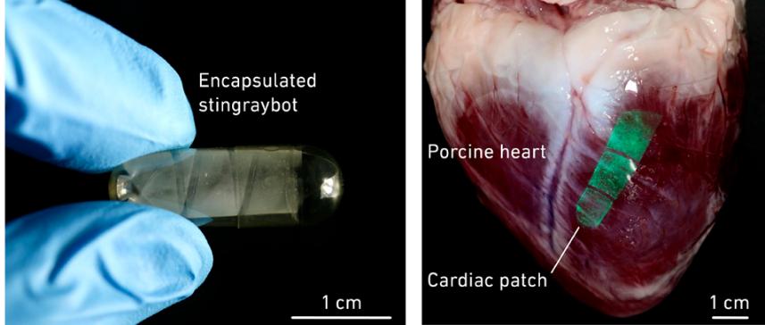 为了展示本次成果在生物医疗中的应用潜力,他们展示了一种心脏贴片。当超声波激活的时候,人工肌肉就可以适形的贴在猪的离体心脏上。