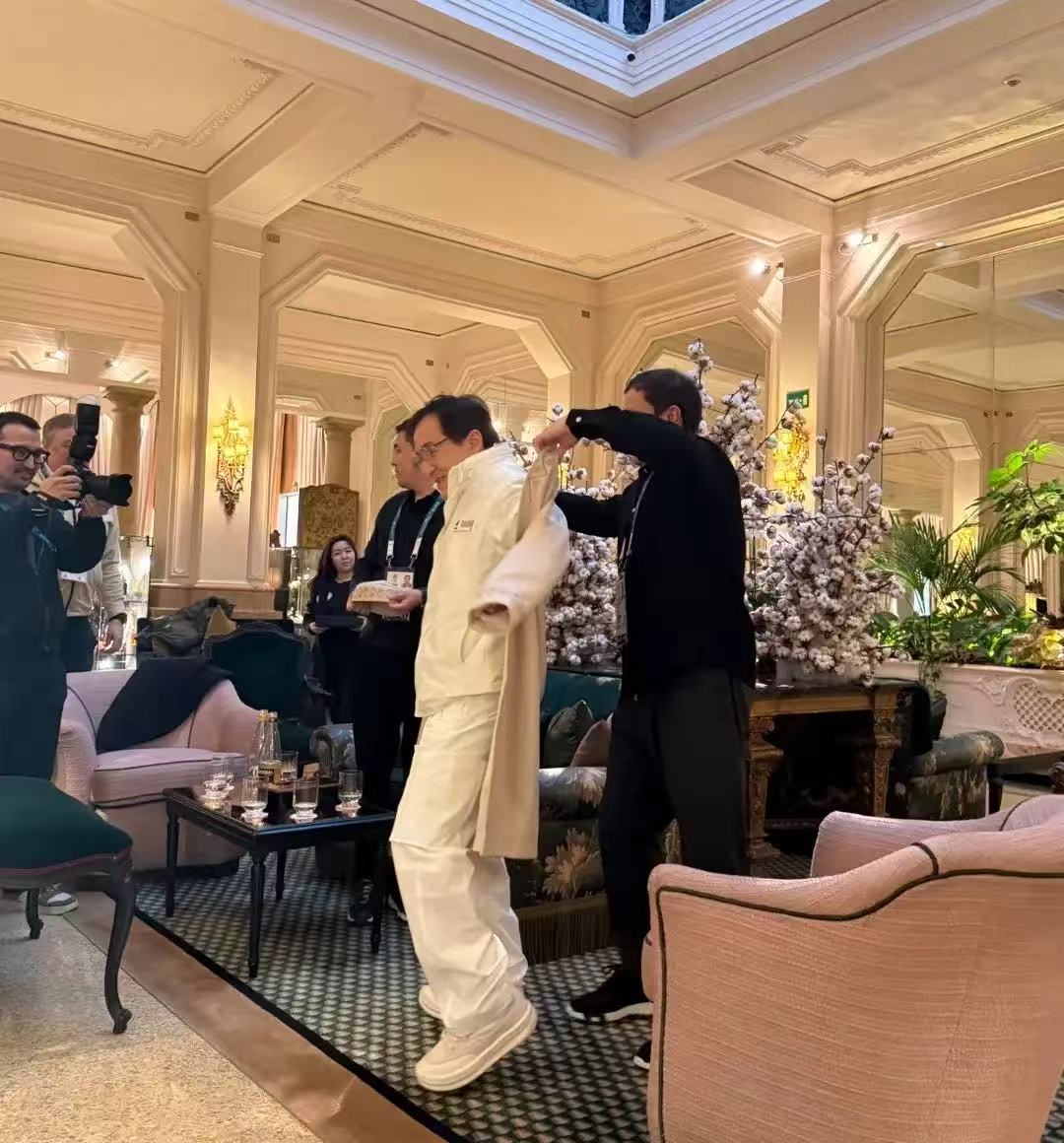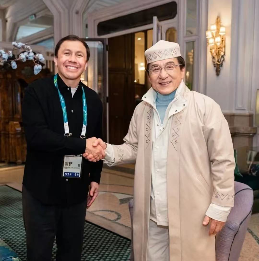 成龙在世界各地都有粉丝,他出现在休息室被拳击运动员戈洛夫金邀请穿上当地特色的衣服来一张合影。成龙十分配合,这衣服穿在他身上特别有喜感。