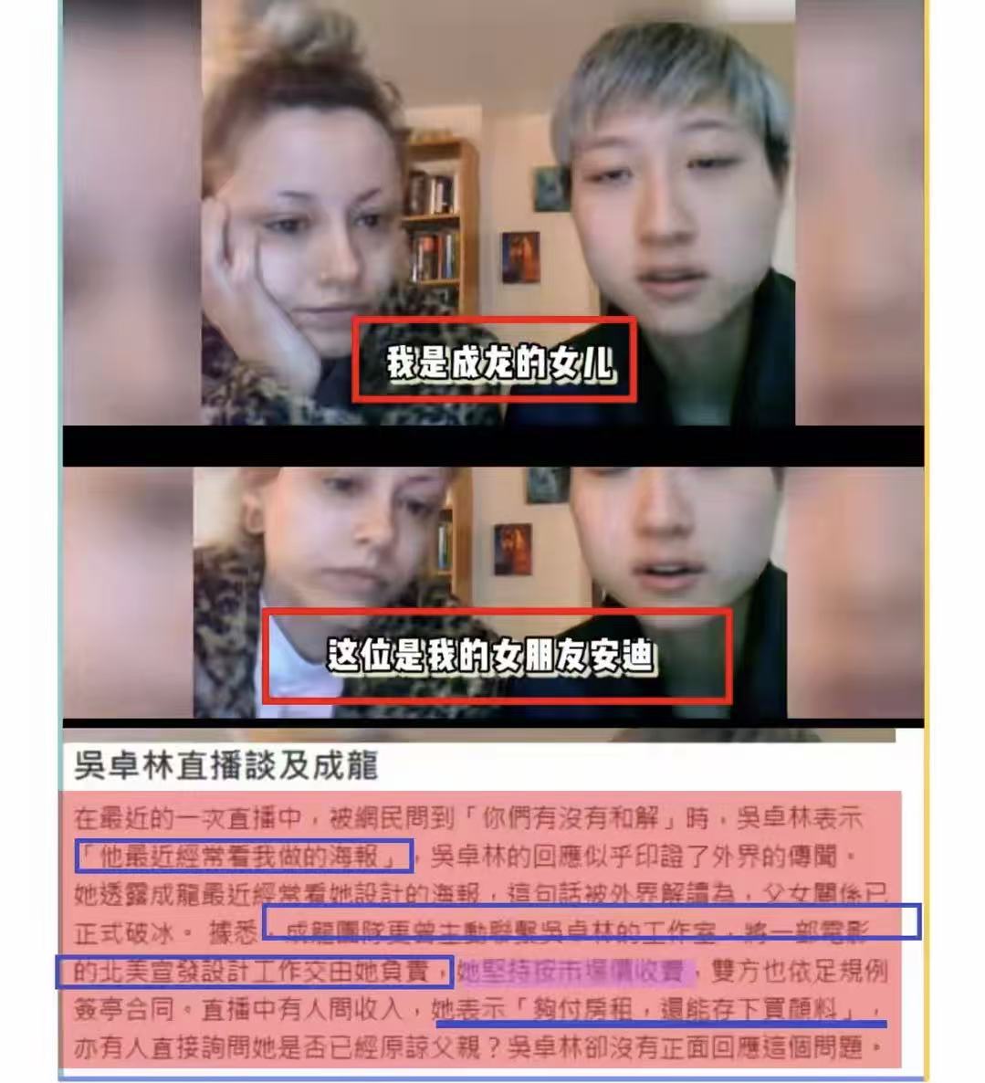 成龙跟女儿的感情也破冰,吴卓林带妻子在香港开了工作室后,成龙经常看女儿做的海报,还把自己电影的海报也让女儿来设计。父女之间破冰后,吴卓林也算争气,设计的海报还是挺不错的。