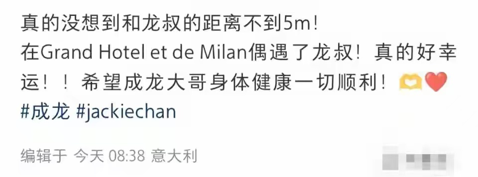 最近有很多网友在米兰偶遇成龙,他跟房祖名一家人在米兰过年,顺便去看冬奥会,他还在冬奥会宣传自己的新电影。粉丝偶遇到他,他也会跟人家合影,很随和。