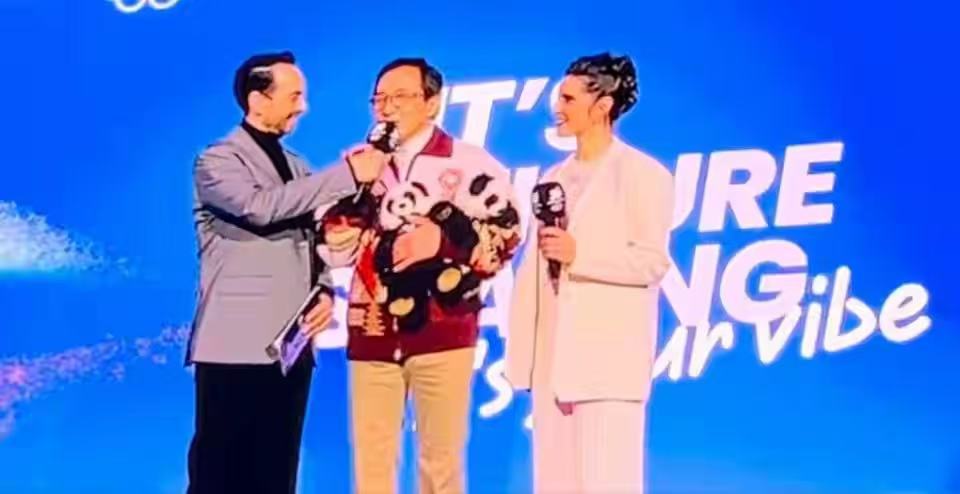 成龙在观众席看花式滑冰表演,被受邀上台,他对着大家说“Happy Chinese New Year!新年快乐。”手上抱着他新电影中的熊猫,为了给成龙一个惊喜,男单冠军萨多洛夫穿上了熊猫的衣服现身,把成龙惊喜到哈哈大笑,给了他一个超大力的拥抱。