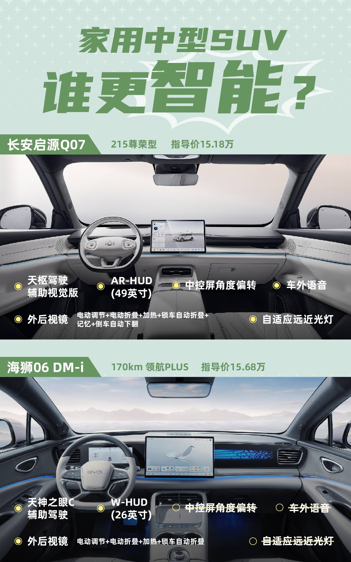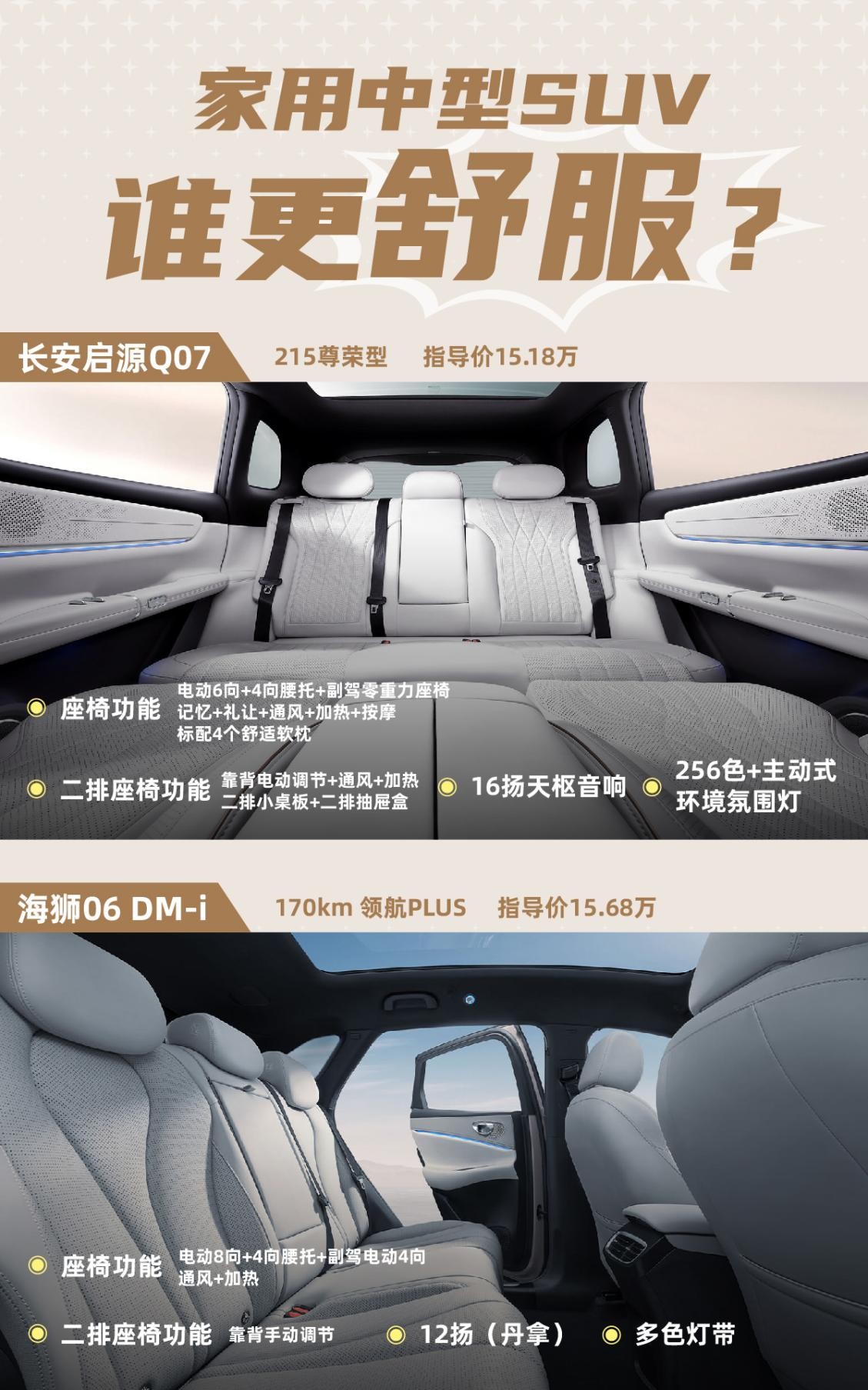 目前2台SUV价格重叠的是15万左右配置,所以本文我们就主要针对这个价位的配置,也就是长安启源Q07 2025款 215 尊荣型(15.18万)、海狮06DM 2025款 DM-i 170KM领航Plus版(15.68万),进行比较。另外本文专注2台车对家用影响较大的空间、舒适体验、配置和续航动力层面的比较,至于见仁见智的设计则由大家去评判。