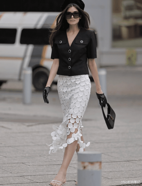 黑色V领上衣搭配设计感十足的白色半身裙,裙身是圆形拼接设计而成,裙下摆的圆形流苏在微风中飘扬,街拍走动中摇曳生姿。