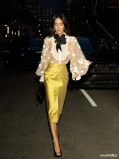 白色大波点衬衫充满复古与时尚,半透明的面料散发出成熟魅力,搭配亮黄色缎面裙,直接拿捏穿搭的精髓。