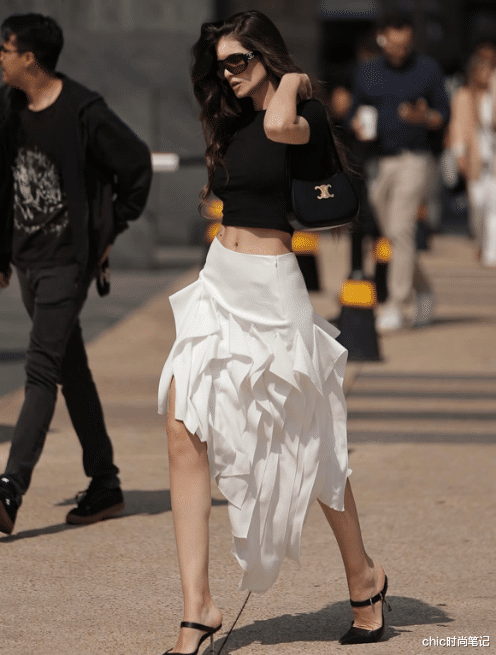 小体量黑色T恤搭配白色不规则百褶半身裙,小露腰身尽显身材与气质,选择黑色高跟鞋和黑色包包作为穿搭点缀,直接拿捏时尚感。这套look来五一出行,包出片的。