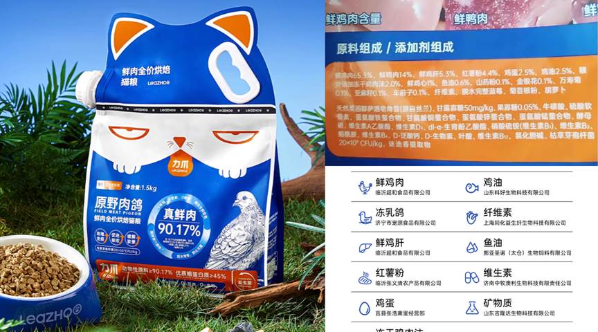 力爪,这个2021年成立的品牌隶属于苏州维亿,靠山东汉欧代工,在年轻宠主中有点名气。主打“高鲜肉+冻干”,配方是无谷物、无肉粉的,产品线只覆盖猫粮和猫零食。力爪猫粮怎么样?原料标注鲜鸡肉65.3%、鲜鸭肉14%,添加冻干鸡肉沫提升口感,碳水来源是红薯粉。营养上蛋白质45%、脂肪18%。