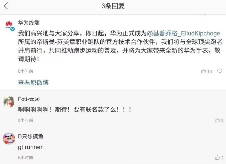 其实,业内人士对于此次发布会上将迎来全新跑步手表的重磅回归的猜测也并非空穴来风。在上个月初,华为曾宣布与dsm-firmenich跑步队(帝斯曼-芬美意职业跑队)及马拉松传奇巨星埃鲁德·基普乔格建立战略合作伙伴关系。这一重量级合作无疑是为新一代专业跑步手表进行的前期造势,旨在将顶尖运动员的专业数据与反馈融入产品研发,从而在专业跑步领域建立更深厚的品牌与技术壁垒。并且, @华为终端 官博在留言中还称,将带来全新的华为手表。