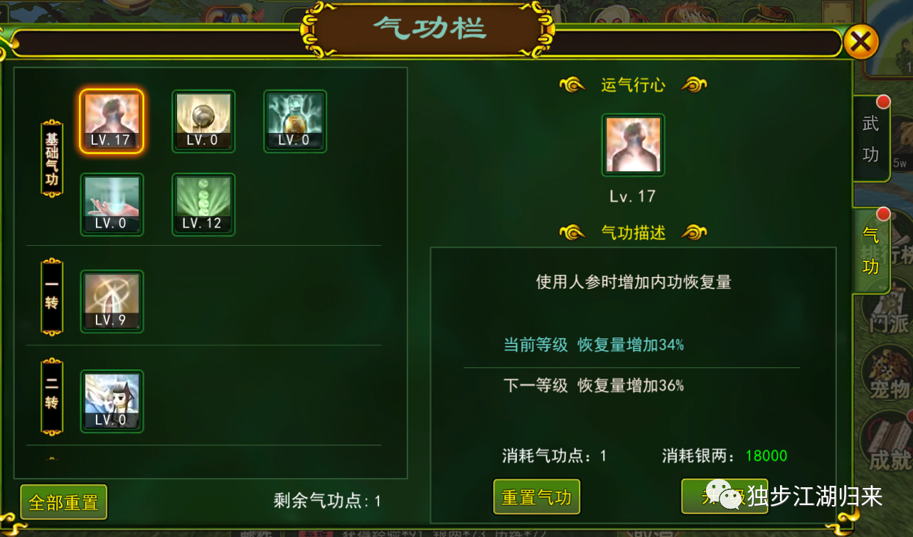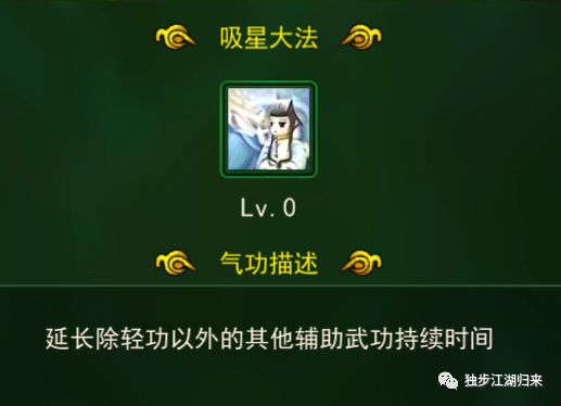 吸星大法:延长除轻功以外的其他辅助武功持续时间,这是二转之后的气功,给咱们的增益BUFF又延长了时间。