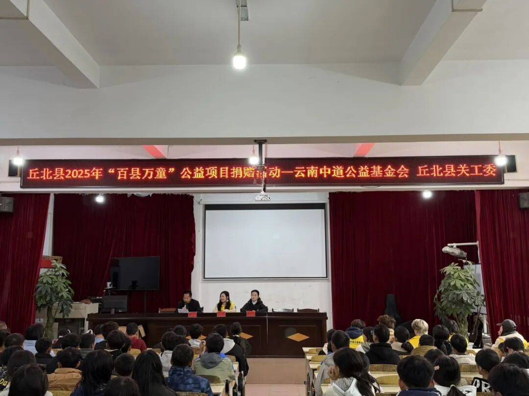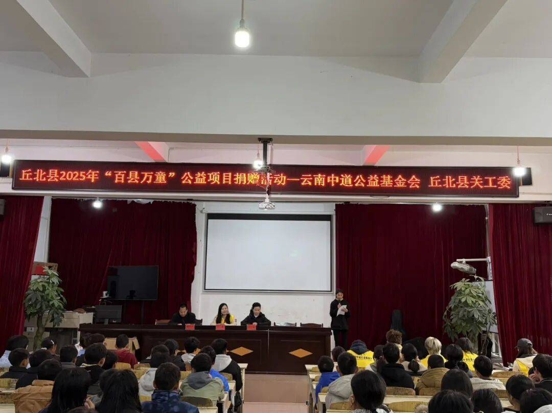 为深化未成年关爱保护工作,助力青少年健康成长,12月17日,由丘北县关工委、云南中道公益基金会联合开展的“百县万童”公益项目捐赠活动在丘北县双龙营第一中学校顺利举办。云南中道公益基金会会长王思聪女士、共青团丘北县委书记董兴颖、学校校长阚绍欢同志出席活动,与师生代表共同参与了此次暖心活动。