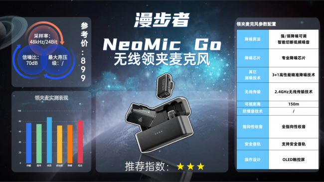 收音清晰:支持48kHz/24Bit采样,信噪比达90dB,2.4G传输250米视距内稳定,能捕捉细微声音细节,内置双重降噪,就算户外嘈杂环境,也能还原纯净人声。