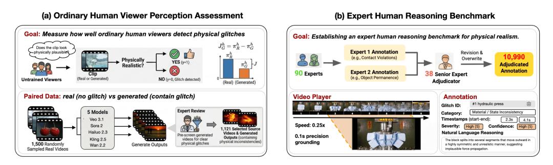 数据上,第三人称部分来自 WISA-80K,第一人称部分基于 EPIC-KITCHENS 构建。为了保证标注质量,论文组织了 90 位具有 STEM 背景并接受过本科物理训练的专家标注者,采用双人标注和资深专家裁决的流程,最后得到的是带时间戳、错误类别和文字解释的高质量标注。